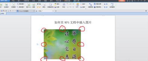 4、图片插入文档中,鼠标放在图片上方的原点可旋转图片方向,四周9个小方块可伸缩图片大小;