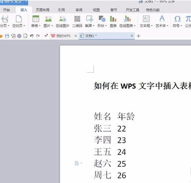 在wps文字上侧选择插入,将窗口切换至插入操作窗口界面,如图所示,并在插入操作窗口界面找到【表格】。